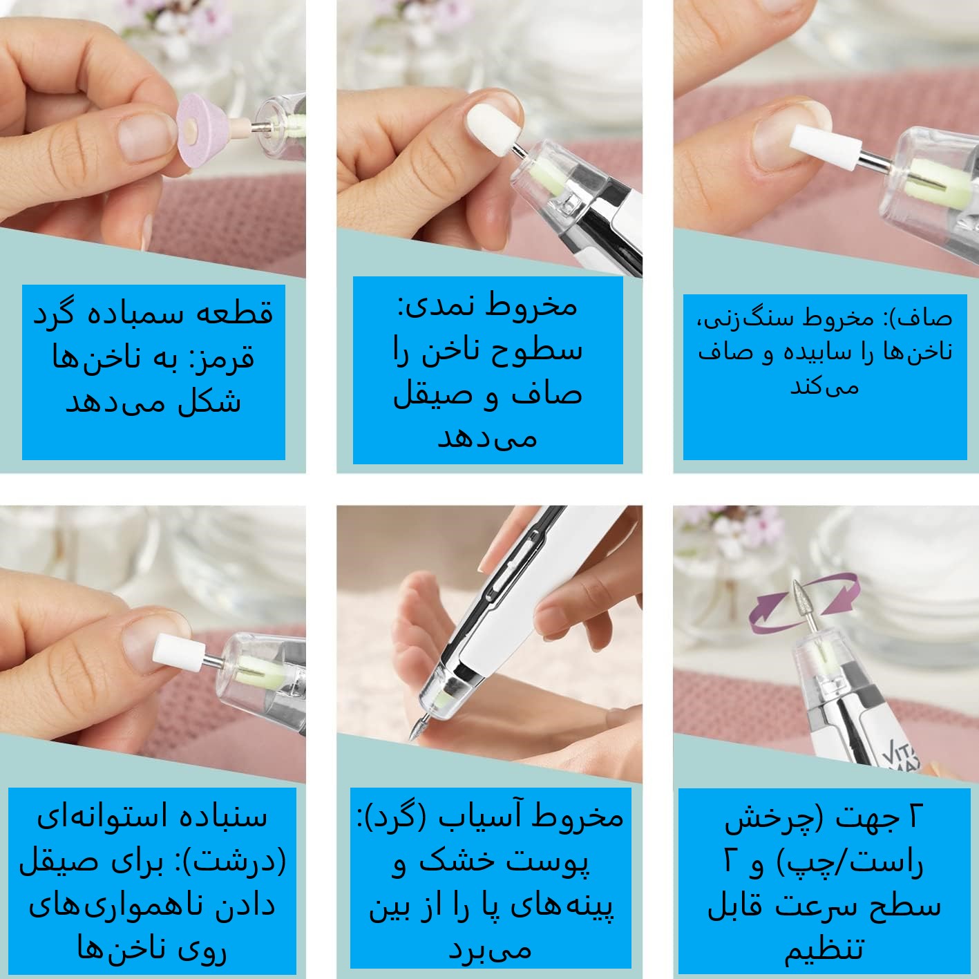 ۵ قطعهی قابل تعویض آسان برای سوهان زدن، تمیز کردن، صیقل دادن، پاک کردن و سمباده زدن بقایای لاک ناخن. ناخنها را سوهان بزنید، لاکهای سفت و بقایای کوتیکول را بدون افزودنیهای شیمیایی پاک کنید و ناخنها را تا درخشندگی بالا براق کنید.